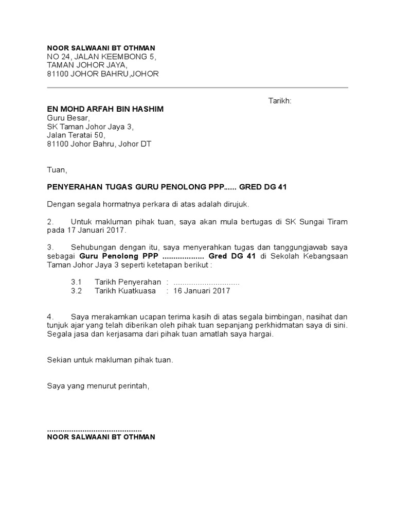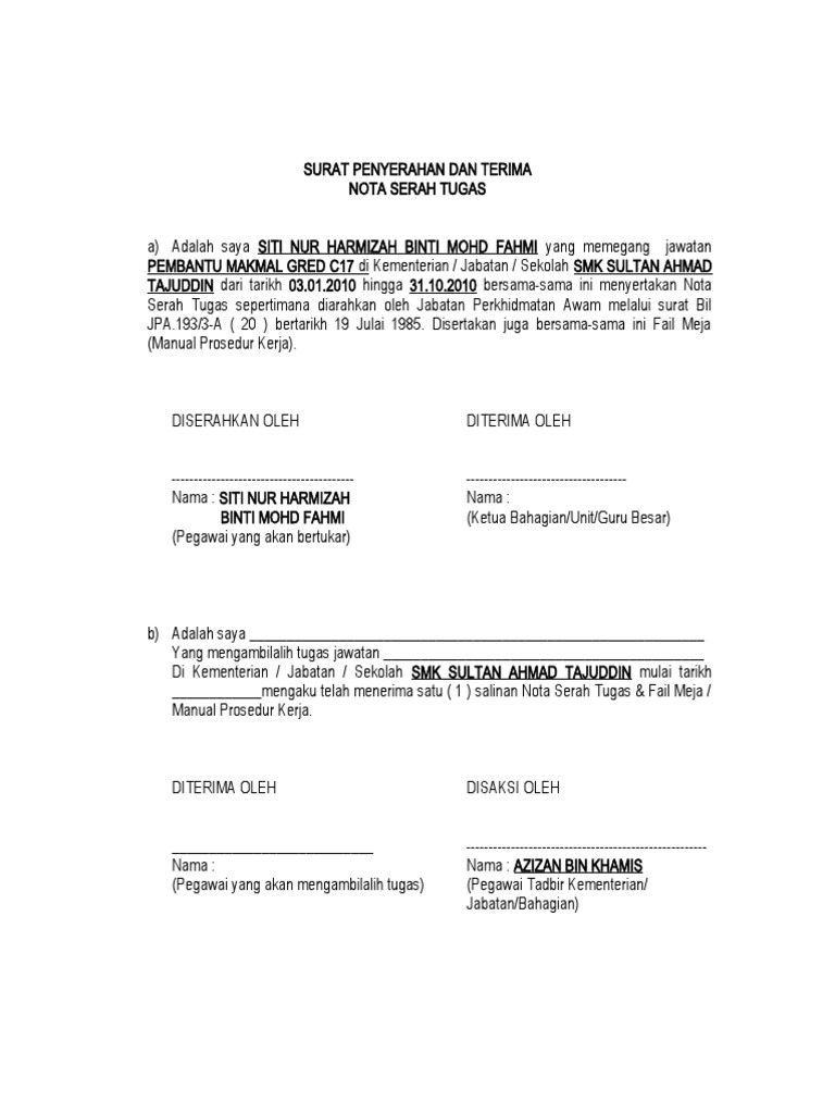 Lampiran senarai serahan tugas bi l 1. Surat serahan tugas nota serah tugas.borang kutipan dan serahan guru ke pejabat darjah. Untuk lebih jelasnya, berikut ini contoh surat tugas dengan berbagai jenis dan tujuan. Surat tugas adalah surat yang dibuat oleh instansi atau perusahaan untuk memberikan suatu tugas khusus kepada karyawannya. Apakah anda sudah memahami apa itu surat tugas ?